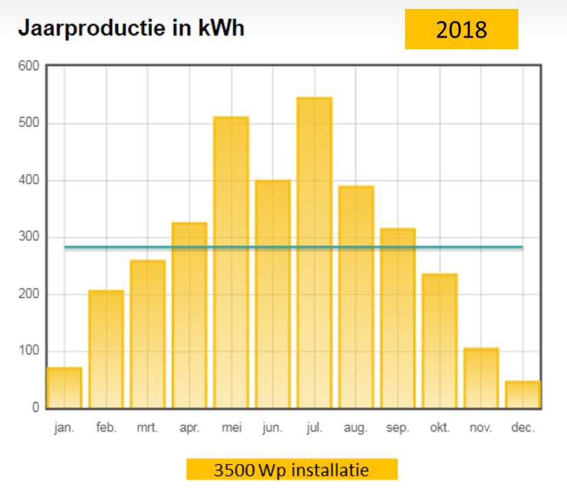 Hieronder is een weergave van de opbrengstverdeling in 2018 per maand van een goed functionerende zon PV installatie in het midden van het land met een geïnstalleerd vermogen van 3500Wp.